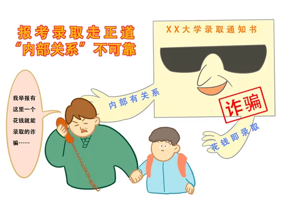 以往“内部招生”“特殊指标”“补录”等骗局常常出现在高考志愿录取结束后。不法分子谎称某高校名额没能招满,通过花钱“打点”可让考生获得特殊指标或补录名额。近些年,有骗子在考前就用各种借口,让家长交钱保留名额。警方提醒:高考招生录取系统有严密的全国统一的认证加密体系和监督机制。所谓花钱能上好大学、好专业,分数不够也能上大学的都是骗人的伎俩。考生和家长要从正规渠道了解、确认考试招生政策和信息,时刻保持清醒头脑,收到来历不明的通知书要仔细甄别,切勿轻信。一旦发现受骗,请及时报警。